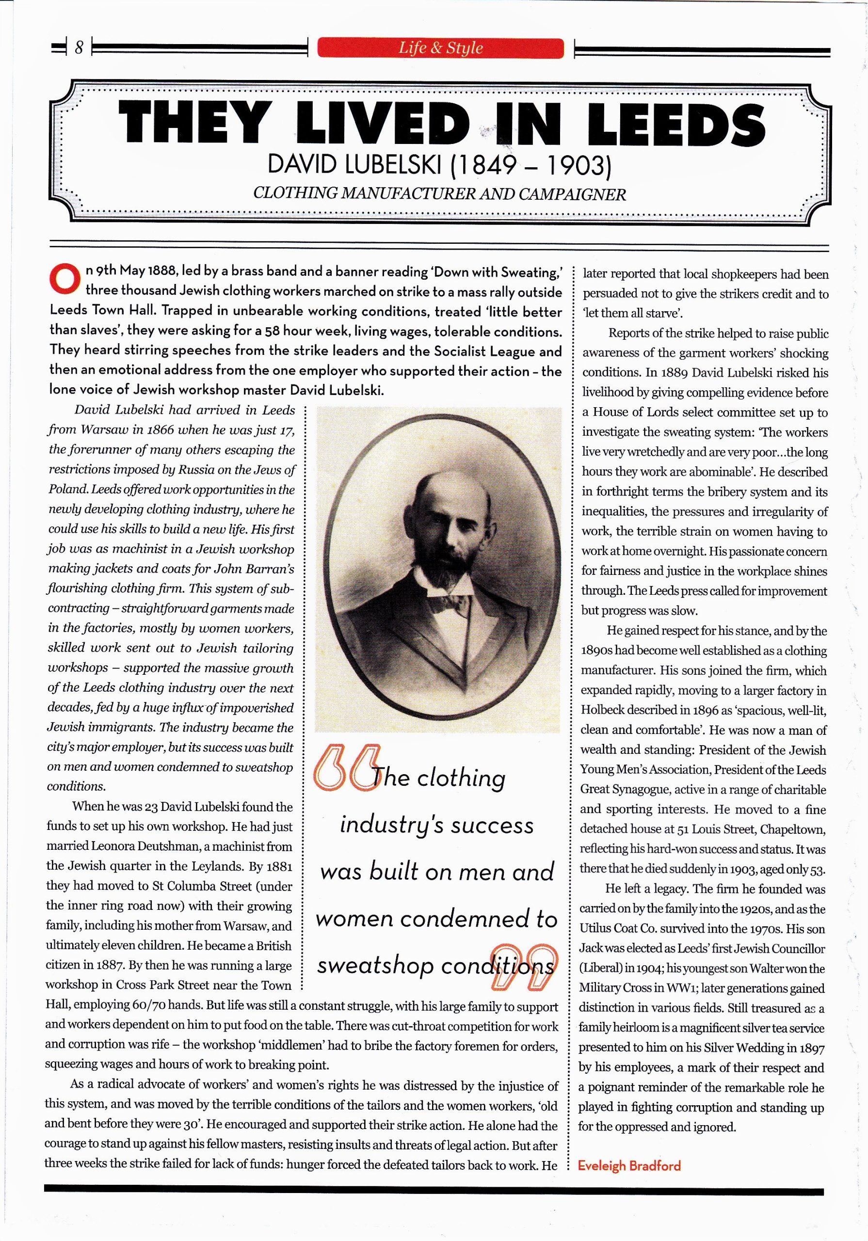 I often wondered why his employees honoured David Lubelski with such a generous gift. It was only in 2009 that I learnt that David Lubelski was a hero of his time and one of the early champions of women’s rights.(Industrial historian Professor Katrina Honeyman)